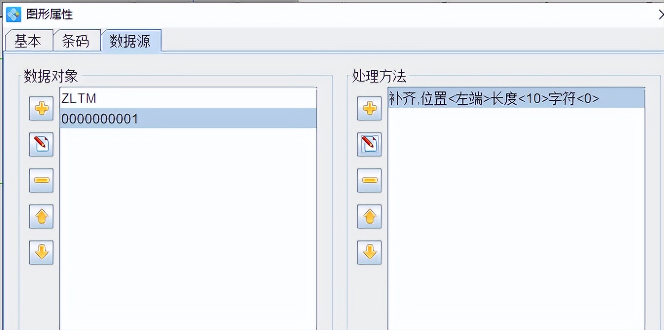 3)在“图形属性”数据源中修改PDF417二维码的数据内容(二维码生成器软件中的数据类型有:数据库导入、随机生成、序列生成、手动输入等),在这里我们选择“手动输入” ZLTM;和“序列生成”开始字符串1,并添加处理方法“补齐”-位置“左端”-长度“10”点击确定;