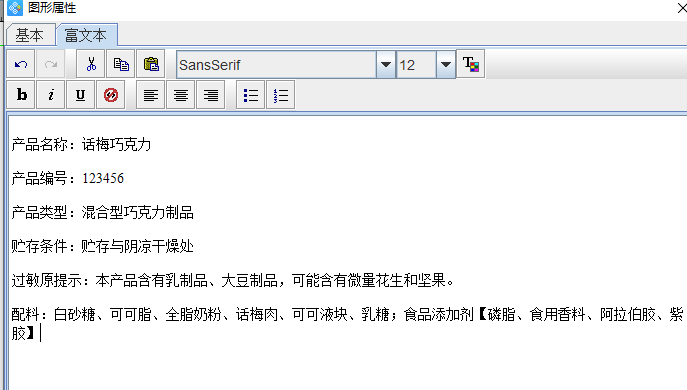 鼠标双击富文本,在“图形属性”——“富文本”窗口下进行删除软件默认的123456文字,编辑想要固定显示的文字内容,如下图;